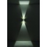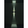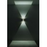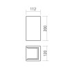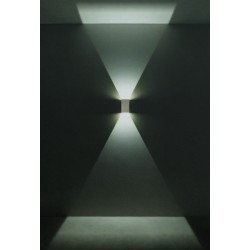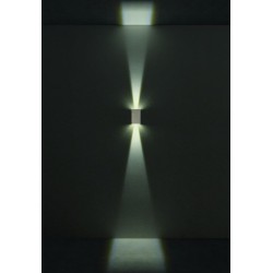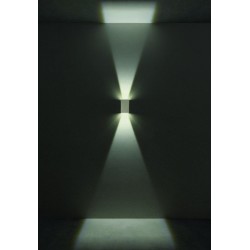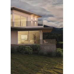 Applications pour l'extérieur équipées de LEDs à puissance, dispersion lumineuse directe/indirecte avec angle réglable. Corps en béton fini ivoire, gris foncé ou terre cuite et aluminium peint en champ électrostatique gris mat, diffuseurs en verre transparent.